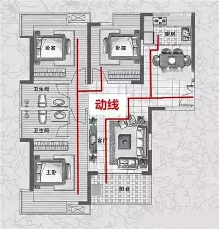 ??動線就是指人們活動的路線,它根據人的行為方式把一定的空間組織起來。換句話說,就是人在室內室外的移動點,聯合起來就成為了動線。動線設計一般由兩部分構成,一是固定物件的擺設,二是人流、物流的路徑。戶型動線一般分為三類:家人動線、家務動線和訪客動線。三種動線在涉及區域和設計要點方面都有所不同。