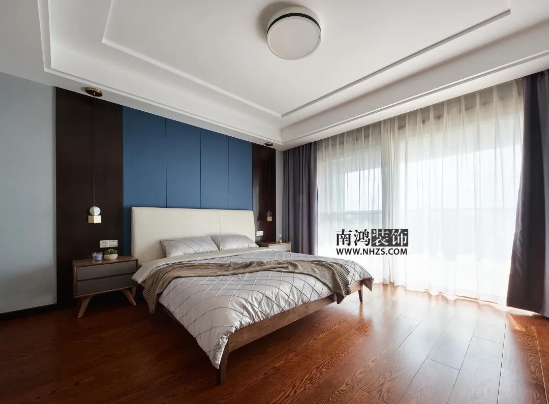 主臥背景選用亞麻色的印花墻紙,亞麻色比白色溫暖,比黃色低調,搭配任何顏色都不會突兀。床品點綴深藍,鮮活視覺。
