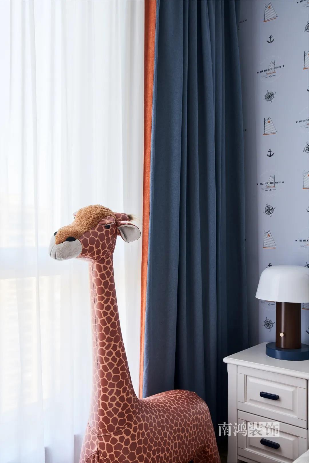 兒童房主打男孩喜愛的藍色系,飛機樣式的吊燈與長頸鹿玩偶充滿著浪漫的想象,將活潑的童趣與審美融合得恰到好處。