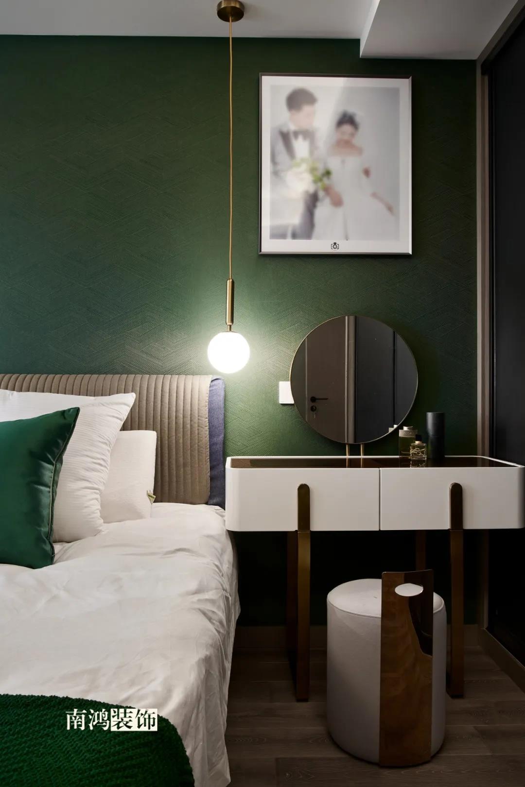 主臥,青草綠墻布做背景裝飾,留白保持簡約調性,一幅婚紗照訴說著夫妻二人簡簡單單、明明白白的甜蜜愛情故事。